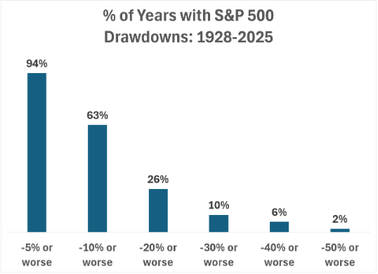History shows that volatility like this is entirely normal. Nearly a century of market data reveals consistent patterns: a 5% pullback occurs in 94% of years, a 10% correction happens in roughly two‑thirds of years, and even 20% drawdowns appear about one out of every four years.